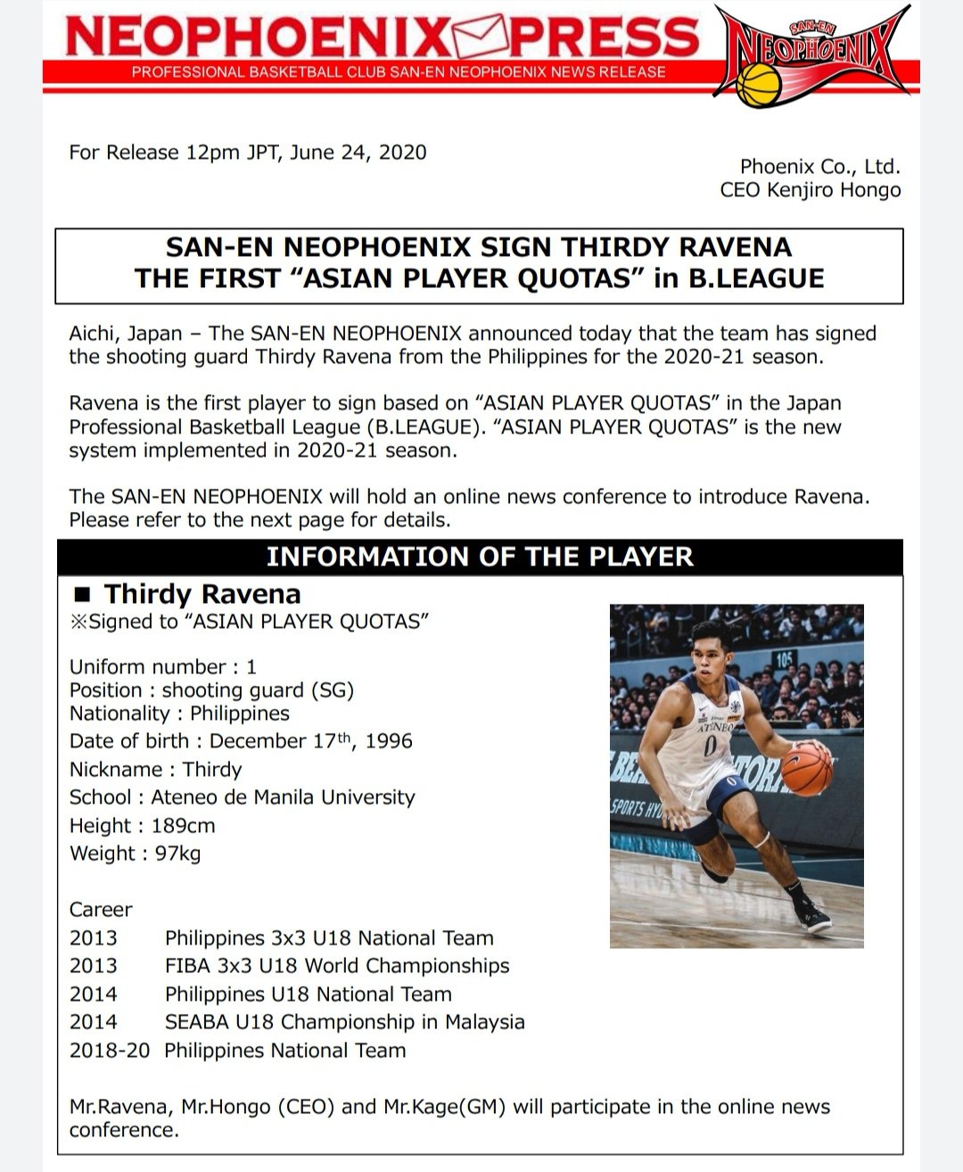 - Thirdy Ravena To Be A Key Player For Upcoming B League Season Say Neophoenix Officials : League Than In Any Local Basketball League.